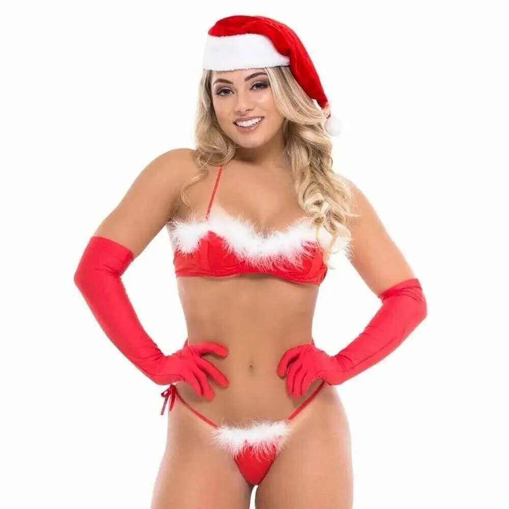 Com a Mamãe Noel Chris você poderá presentear com momentos inesquecíveis o seu amado, é claro se ele tiver se comportado bem! Top com tiras para amarrar nas costas e no pescoço, sendo de fácil ajuste e possuí aro no busto além do detalhe de marabu de plumas no busto. Fio com laterais ajustáveis por tiras, também possui detalhe em marabu de pluma na parte da frente. Você estará pronta para ser o presente!